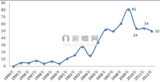 圖表1:1994-2012年我國外診斷行業(yè)專利申請(qǐng)量(單位:件)