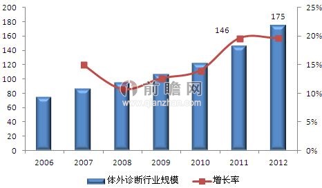 前瞻產(chǎn)業(yè)院《2013-2017年中國體外診斷行業(yè)市場需求預(yù)測與投資戰(zhàn)略規(guī)劃分析報(bào)告》數(shù)據(jù)顯示,2006年以來,國內(nèi)體外診斷產(chǎn)業(yè)以15%左右的年增長率呈現(xiàn)高速增長態(tài)勢。據(jù)統(tǒng)計(jì),2008年我國體外診斷市場規(guī)模已達(dá)95億元,2010年增長至122億元,2011年突破140億元,到2012年,我國體外診斷市場規(guī)模約為175億元。