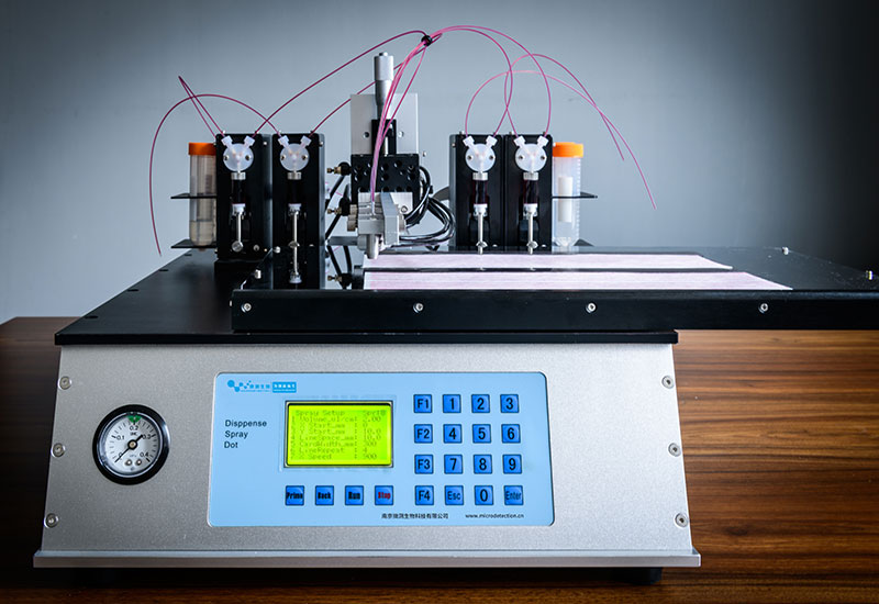 大平臺多通道噴金標(biāo)機(jī)應(yīng)用于生產(chǎn)過程中均勻地把膠體金,熒光微球,量子點(diǎn)等顆粒均勻地噴在聚酯膜,玻纖等材料上。相比于傳統(tǒng)的噴金機(jī),效率大大提高,是特大型企業(yè)必備的生產(chǎn)設(shè)備之一。
